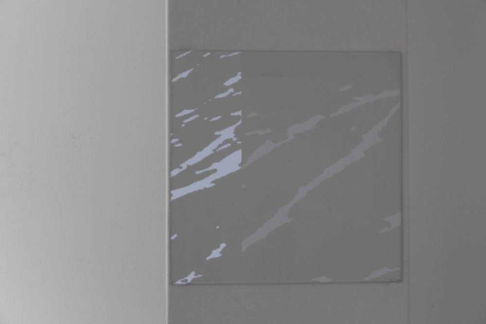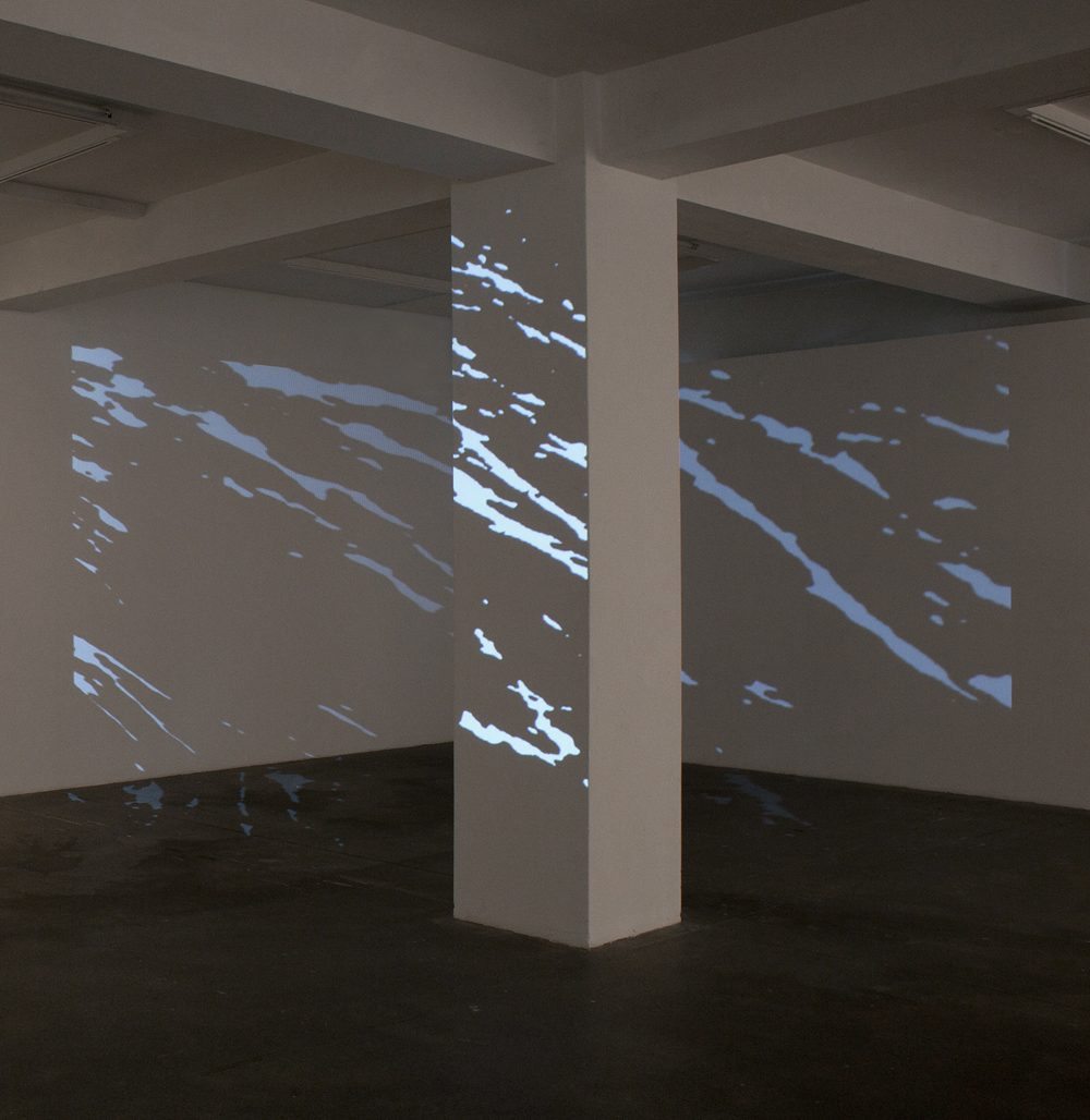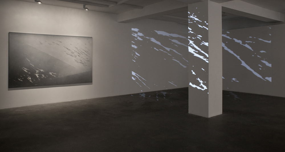Weather Song is a work that has been exhibited in several versions, being plastic and easy to adapt to each exhibition space. The projector is at the center of the installation and displays light patches passing by like scenery seen through the window of a moving car. The video challenges the stability of the painting and pushes it into motion. The time frame of the picture is rather short but it does not show real change but rather the horizontal movement of forms on the wall that travel back and forth from one corner to another. The picture is in black and white, but the white color is based upon snow forms that appear as rays of light on a black background. The Icelandic title of this work, Veðurlag, involves a play on words that refers both to layers of snow and the method of painting in layers.** Hróðmar Ingi Sigurbjörnsson has composed music for this work, based upon old poetic tunes (stemmur), to which Steindór Andersen chants with ballad verses (rímur). The music, the verses and the motion refer to the journey of someone who sets off on a walk across the country, humming to himself to kill time. Opposite the projection is another wall with a painted mountainside over which passes the same pattern of light that is seen in the projection; this moving pattern is reflected onto the wall painting by a glass mounted on the projection wall. The work is layered in time, space and form, and the painting has become an environment in motion, with the viewer at its center. The connection of man and nature with the cycle of life is the core of the content of this work.
